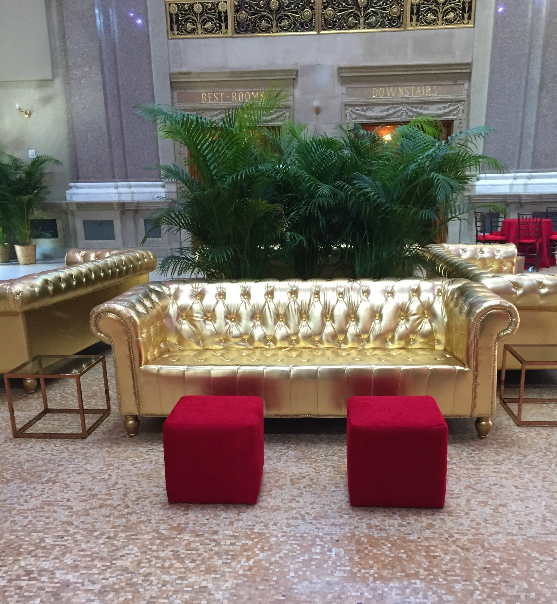 Metallic gold patent leather with tufted
