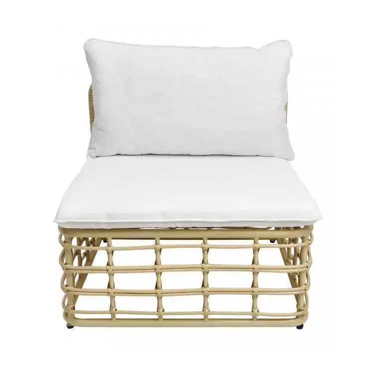 Complete your outdoor lounge setup with the Azure Modular Lounge (Middle Section). Designed to pair effortlessly with the Azure Corner Section, this piece features the same breezy rattan-style frame and plush white cushions. Its armless, modular design allows you to build custom seating configurations for weddings, cocktail hours, or private garden events.