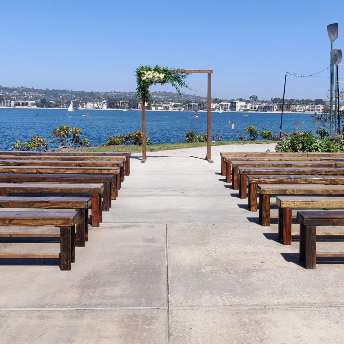 This simple wood arch rental has a wide variety of uses. Deck it out in greenery, wrap it in fabric, or add a simple floral arrangement to create the perfect backdrop for your ceremony.