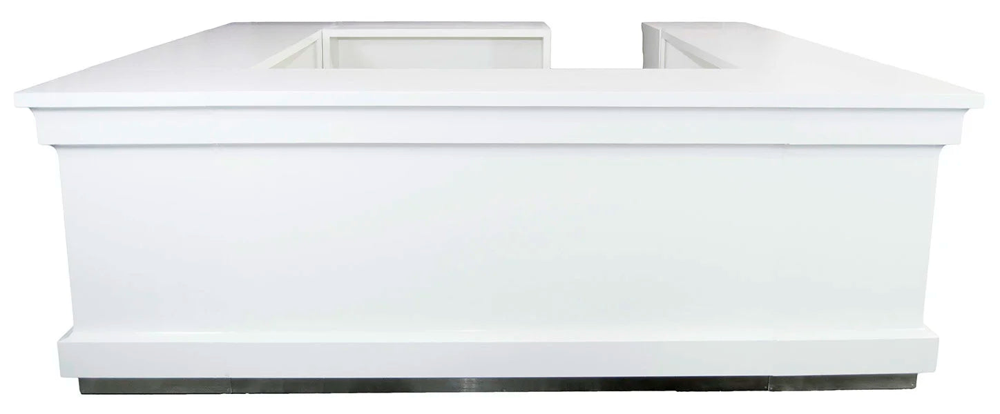 Our Bianco Bar in white lacquer is one of our most popular and versatile bars. The clean lines and neutral color compliment any venue space nicely. This bar is made of durable, lighter weight wood with a white lacquer finish. Whether you want to use the 20’ x 20’ square bar as the focal point of the room or a smaller single 6’ bar to blend into a background, this bar is a very adaptable choice. Ranging in size from a 4’ single bar to a 20’ square bar, the Bianco Bar is perfect for small intimate events with a single bar or large corporate functions with multiple bars. This bar can be used as a side-bar, display table, guest greeting area or even as a DJ booth. The neutral backdrop of this bar can also be customized with your company’s logo or a photo decal. And is the perfect blank slate for any florals you may choose for your space. This bar is available in 4’, 6’ bars or 12’ x 12’, 14’ x 14’, 16’ x 16’ or 20’ x 20’ square bars. No matter the size all the Bianco bars measures 41” in height, so the arrangement of the shape of your bar can be easily adapted to your event space.