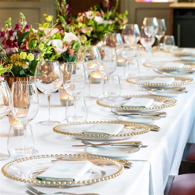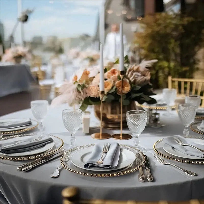 Clear Charger with Gold Beaded Edge! This charger features a crystal-clear glass-like base that creates a sleek, modern canvas while the delicate gold beaded rim adds just the right amount of shimmer and sophistication. It’s the perfect blend of classic refinement and contemporary style, elevating your place settings without overpowering them.