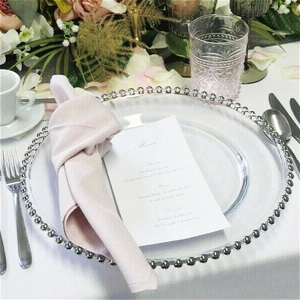 Bring a sleek, polished finish to your event tables with our Clear Charger with Silver Beaded Edge! Featuring a crystal-clear base that pairs seamlessly with any tableware, and a delicately detailed silver beaded rim, this charger offers just the right amount of sparkle without overwhelming your design. It’s ideal for cool-toned color palettes, classic monochrome themes, or minimalist-chic setups.