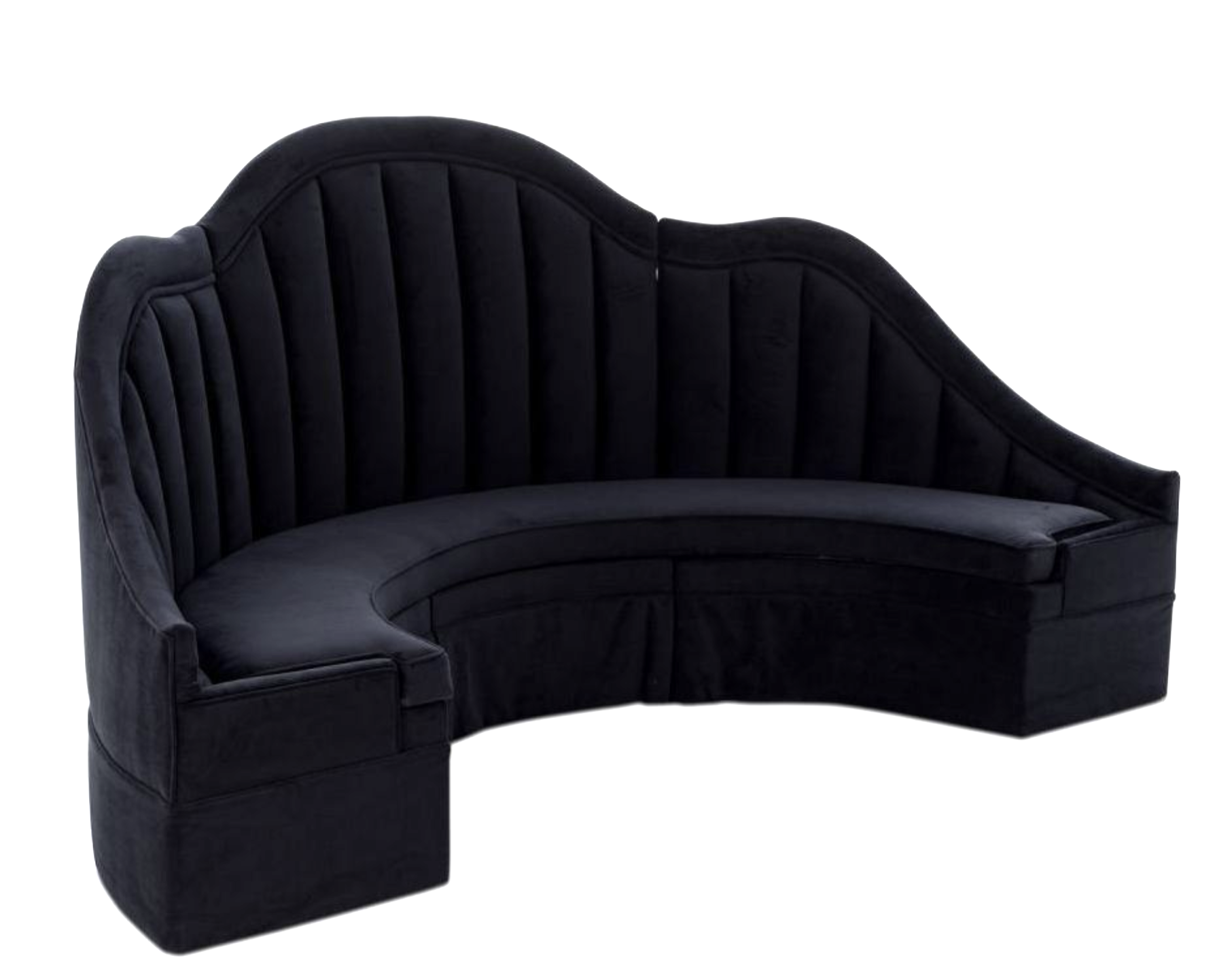 Curved three piece armless booth, velvet fabric with a pleated back.