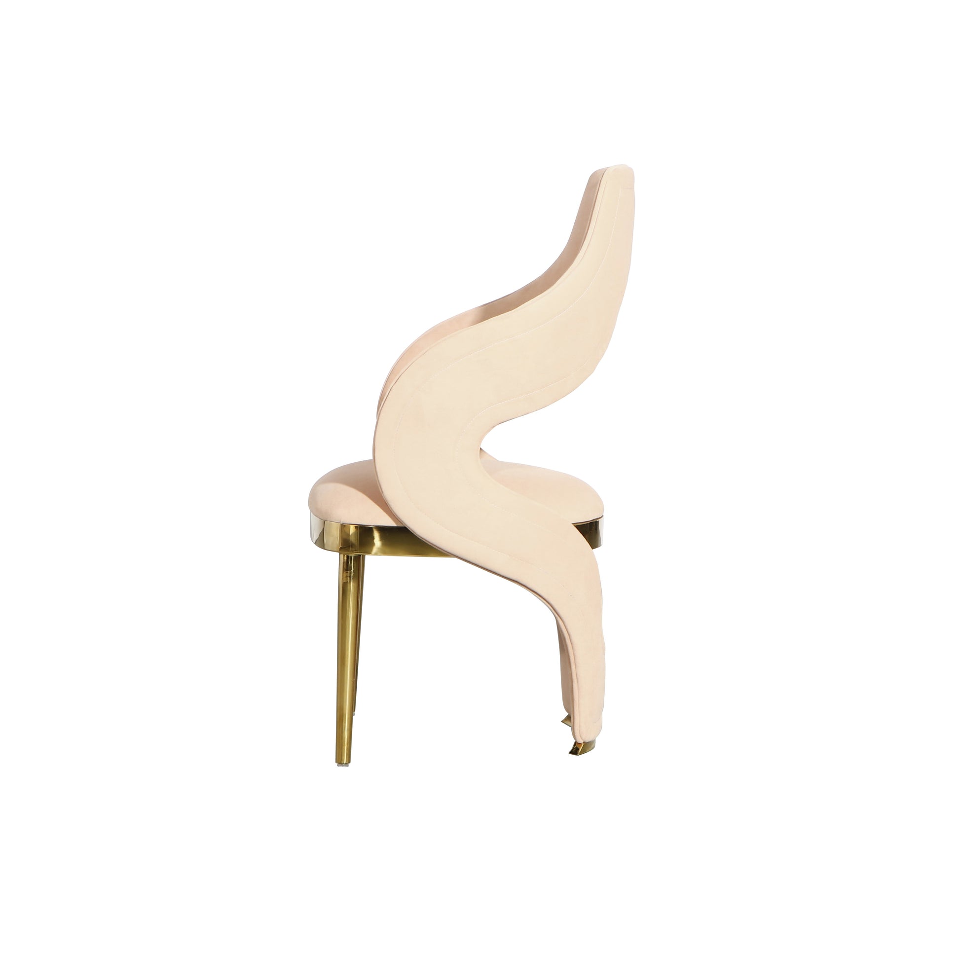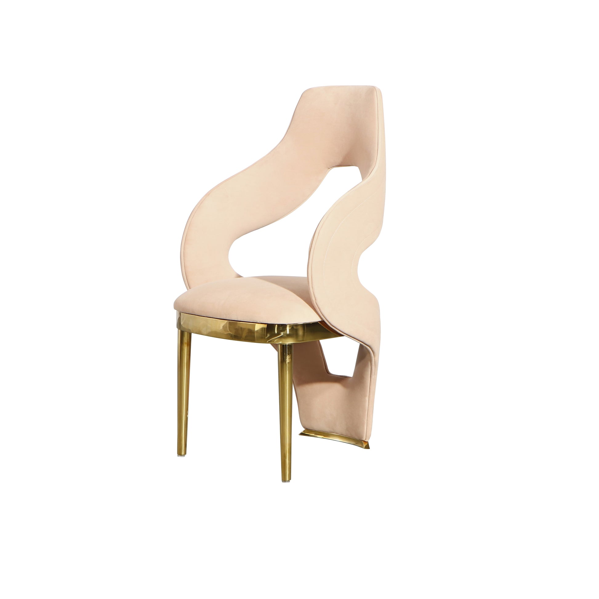 This luxurious chair features a soft blush upholstery, elegantly framed with gold metal accents that add a glamorous touch. Its modern design with the open back and unique silhouette makes it both stylish and comfortable. This chair is available in other colors as well: Navy Blue & White