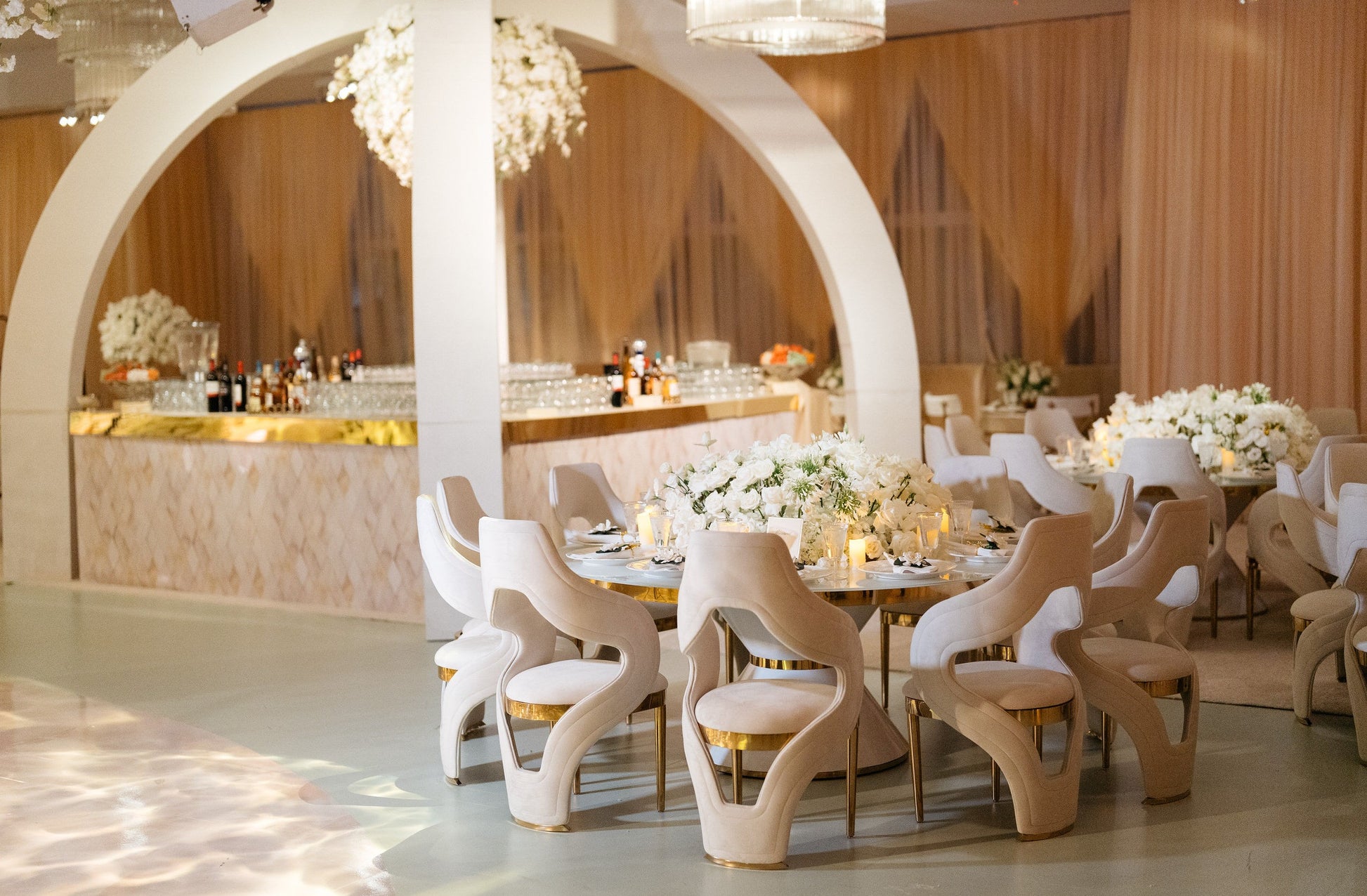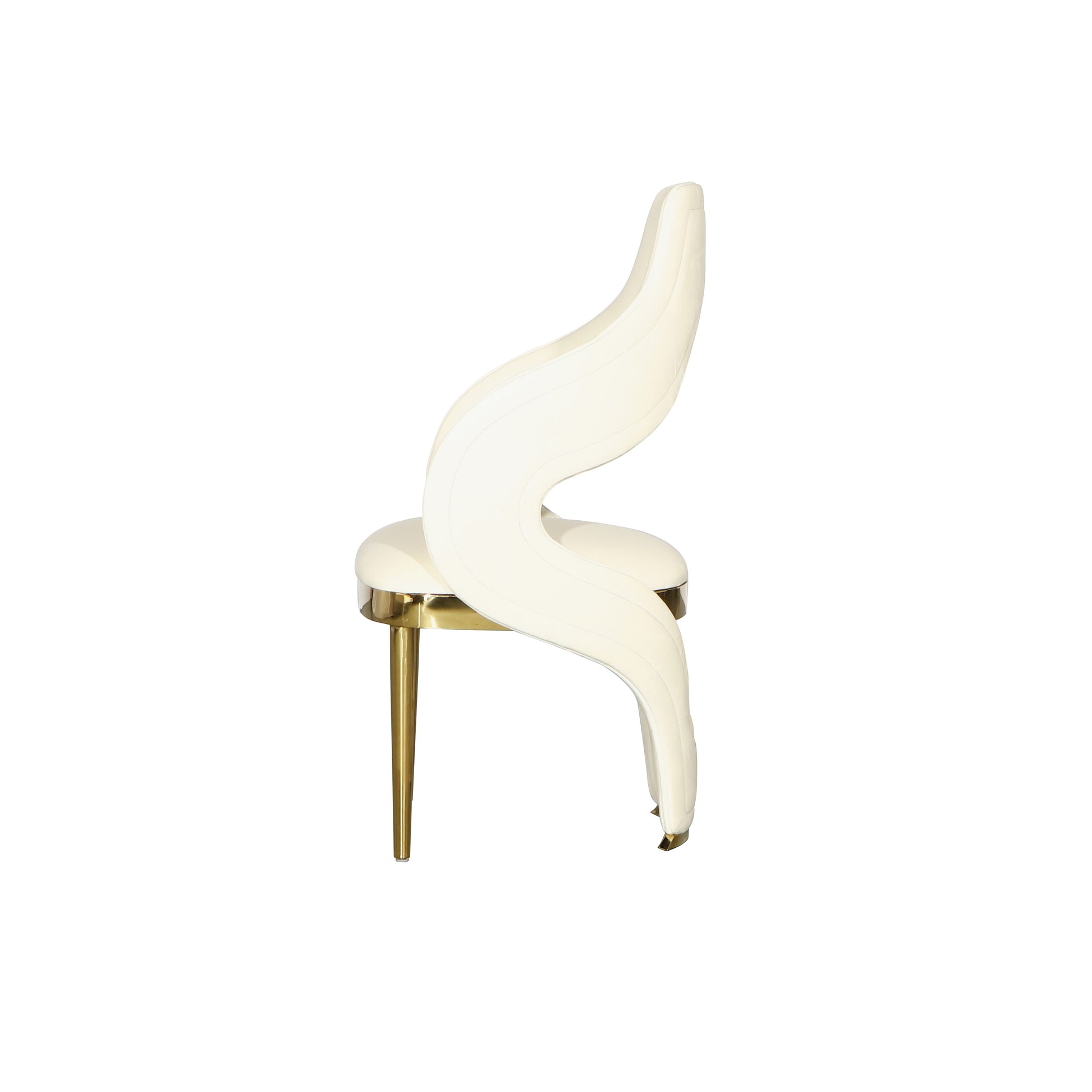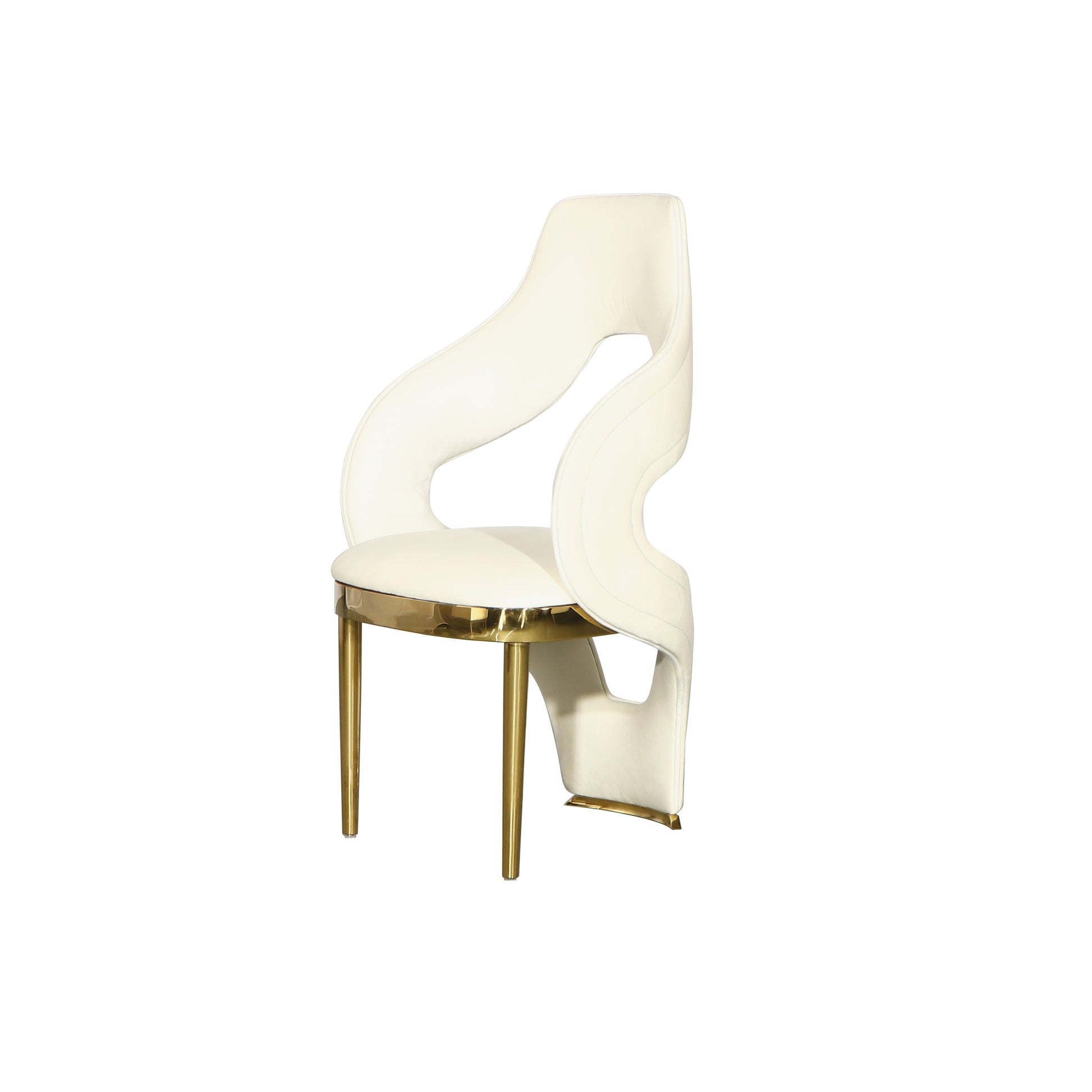This luxurious chair features a soft white upholstery, elegantly framed with gold metal accents that add a glamorous touch. Its modern design with the open back and unique silhouette makes it both stylish and comfortable. This chair is available in other colors as well: Navy Blue & Blush