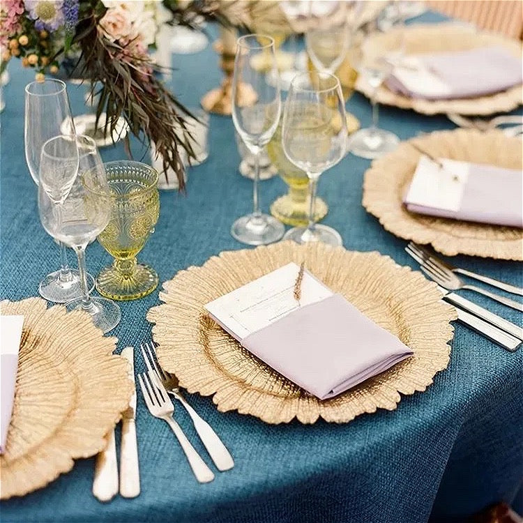 Turn your table into a work of art with our stunning Gold Leaf Charger, an exquisite piece that brings texture, shine, and upscale elegance to any event. Featuring a radiant gold finish with a delicate leaf-textured pattern, the Gold Leaf Charger offers more than just a metallic accent and intricate leaf design adds depth and dimension to your place setting, catching the light in all the right ways and creating a luxurious foundation for your dinnerware.