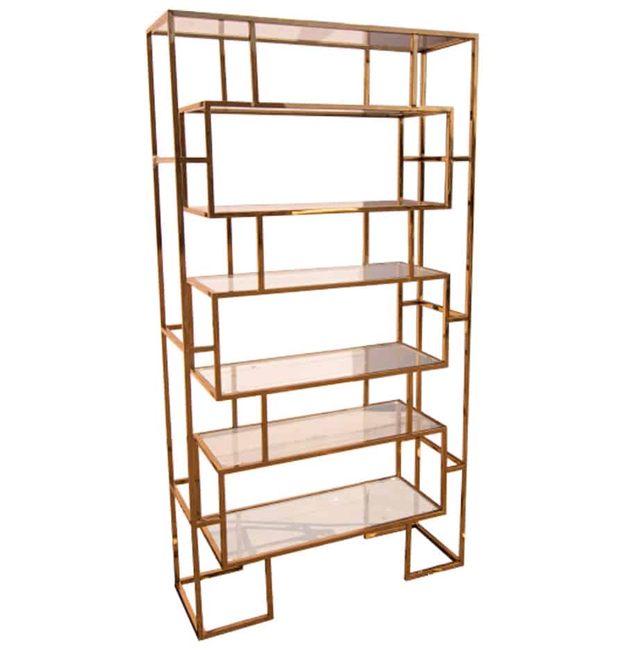 Featuring a sleek gold frame with glass shelving, this back bar offers the perfect showcase for bottles, glassware, or decorative accents at weddings, galas, or VIP lounges. Its open, airy design adds visual interest while keeping service stylish and organized.
