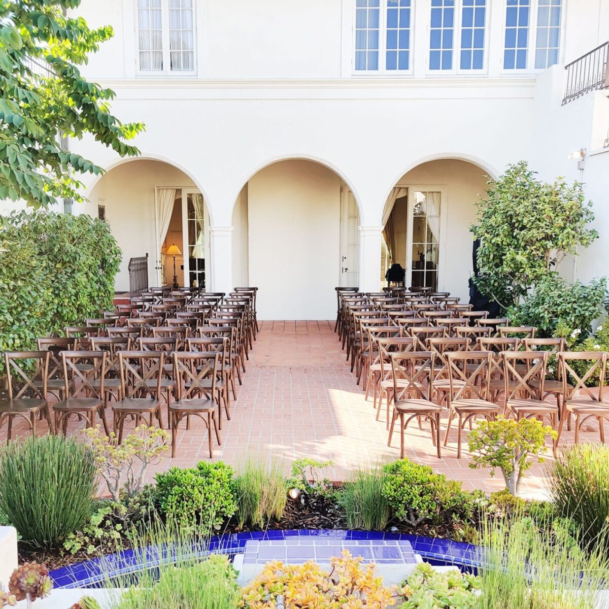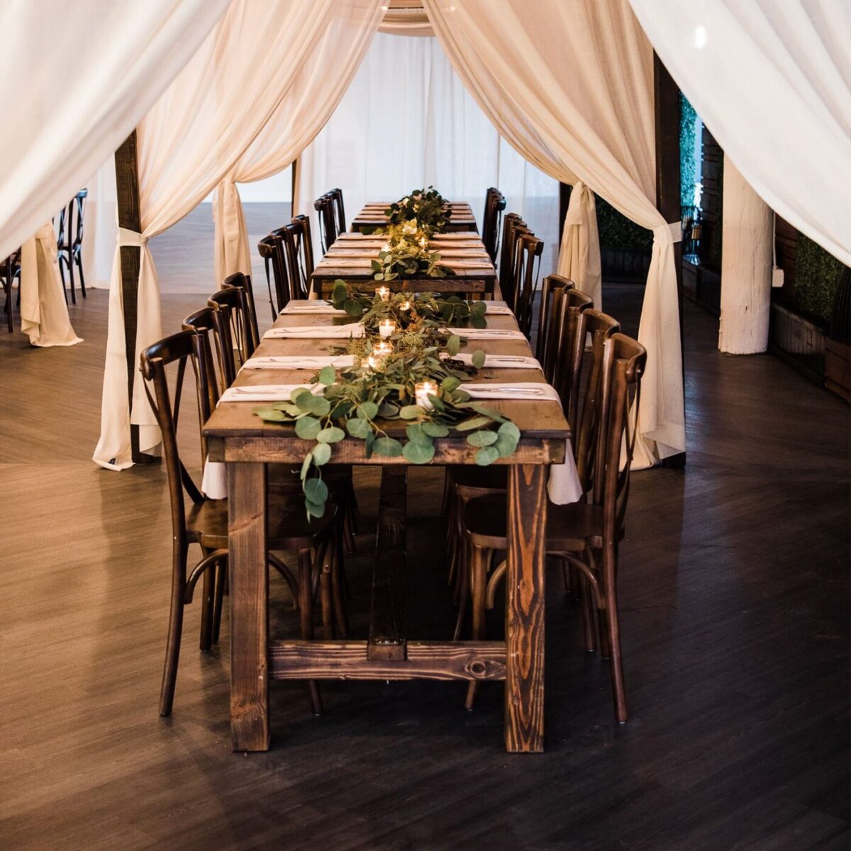 Our Dark Walnut X-Back (Crossback) Chairs provide an elegant look for your event. They pair beautifully with our Dark Walnut Farm Table rentals.
