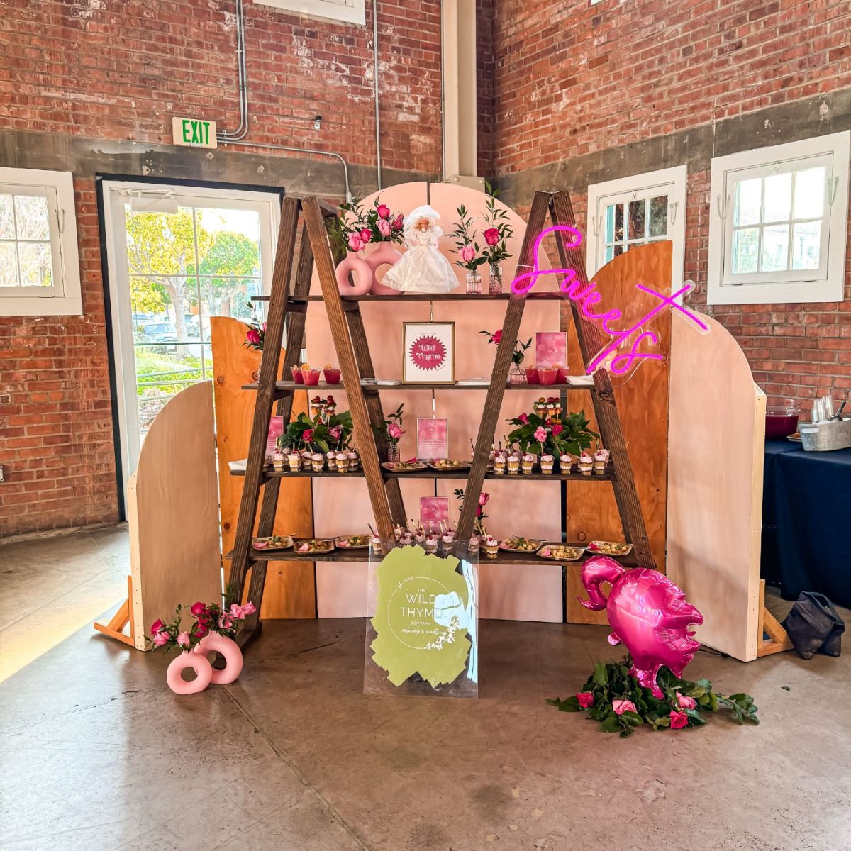 Our handmade wood ladder shelf rental is great for holding photos, as a dessert display, or for use behind one of our many bar options.