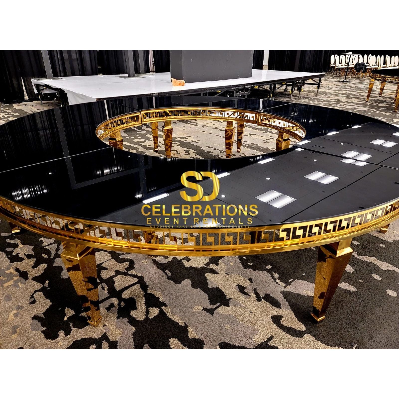 The Luxury Full Donut Round Black & Gold Mirror Table. This stunning piece of furniture is the perfect addition to any modern event or wedding. The table features a sleek black mirror top that is both stylish and durable. The unique donut shape adds a touch of elegance and sophistication to any party. Made with high-quality materials, the luxury full donut round black mirror top & gold frame table is sure to impress. Order yours today and experience the ultimate in luxury and style.