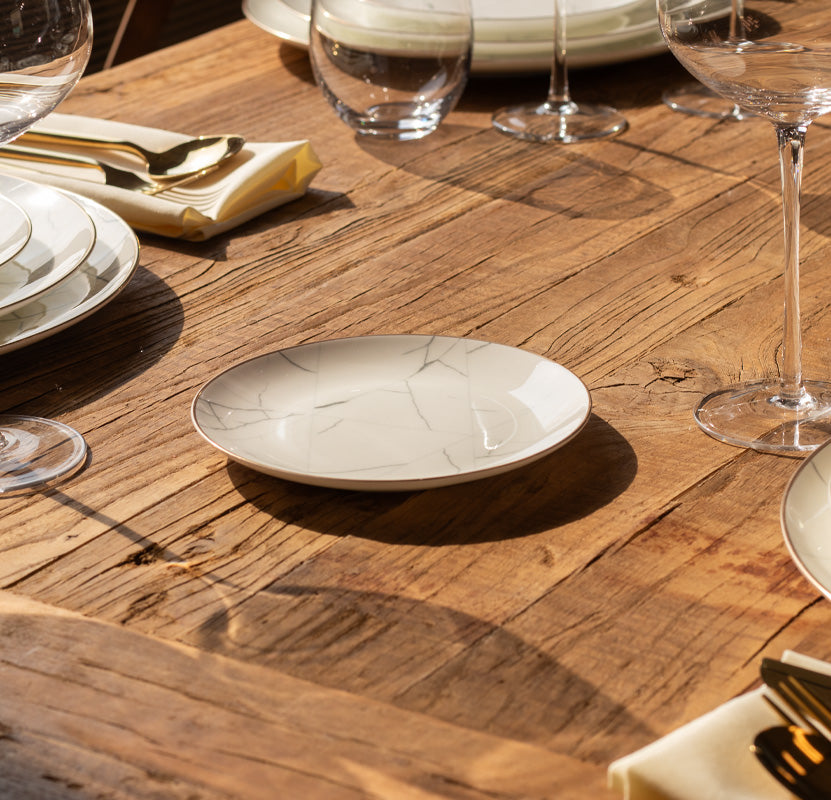 Our 6.5″ Marble Gold Rim Bread Plate combines a stylish marble-like design with a refined gold rim. Perfect for serving bread or small bites, this elegant plate adds a sophisticated touch to any table setting at weddings, dinners, and special events.
