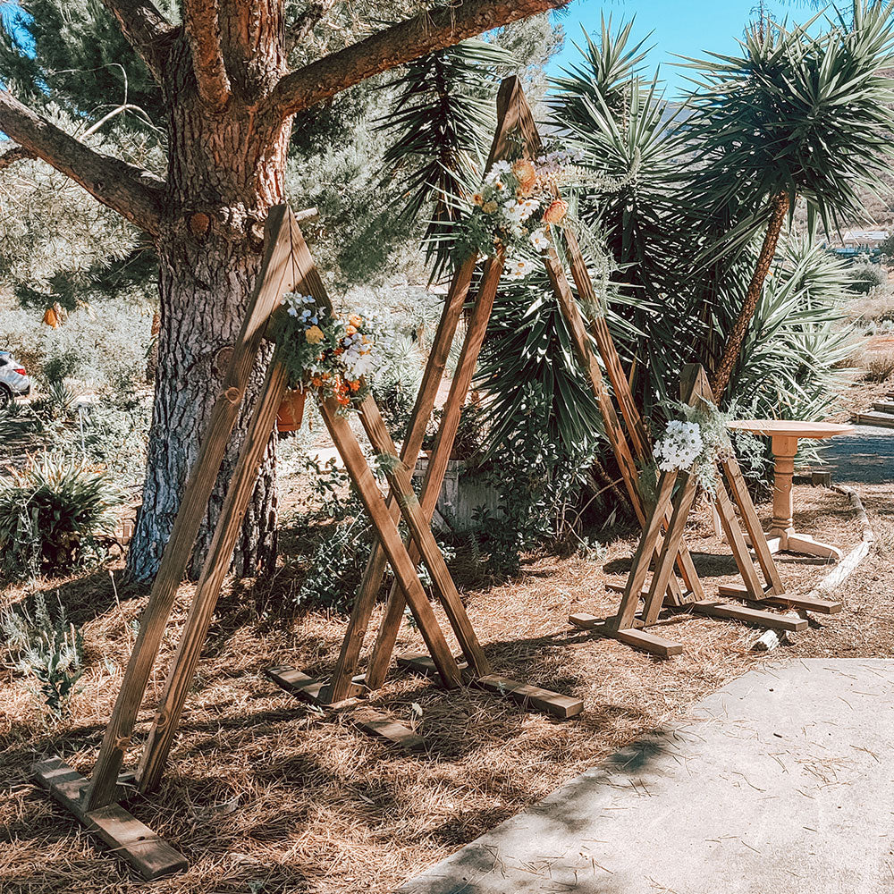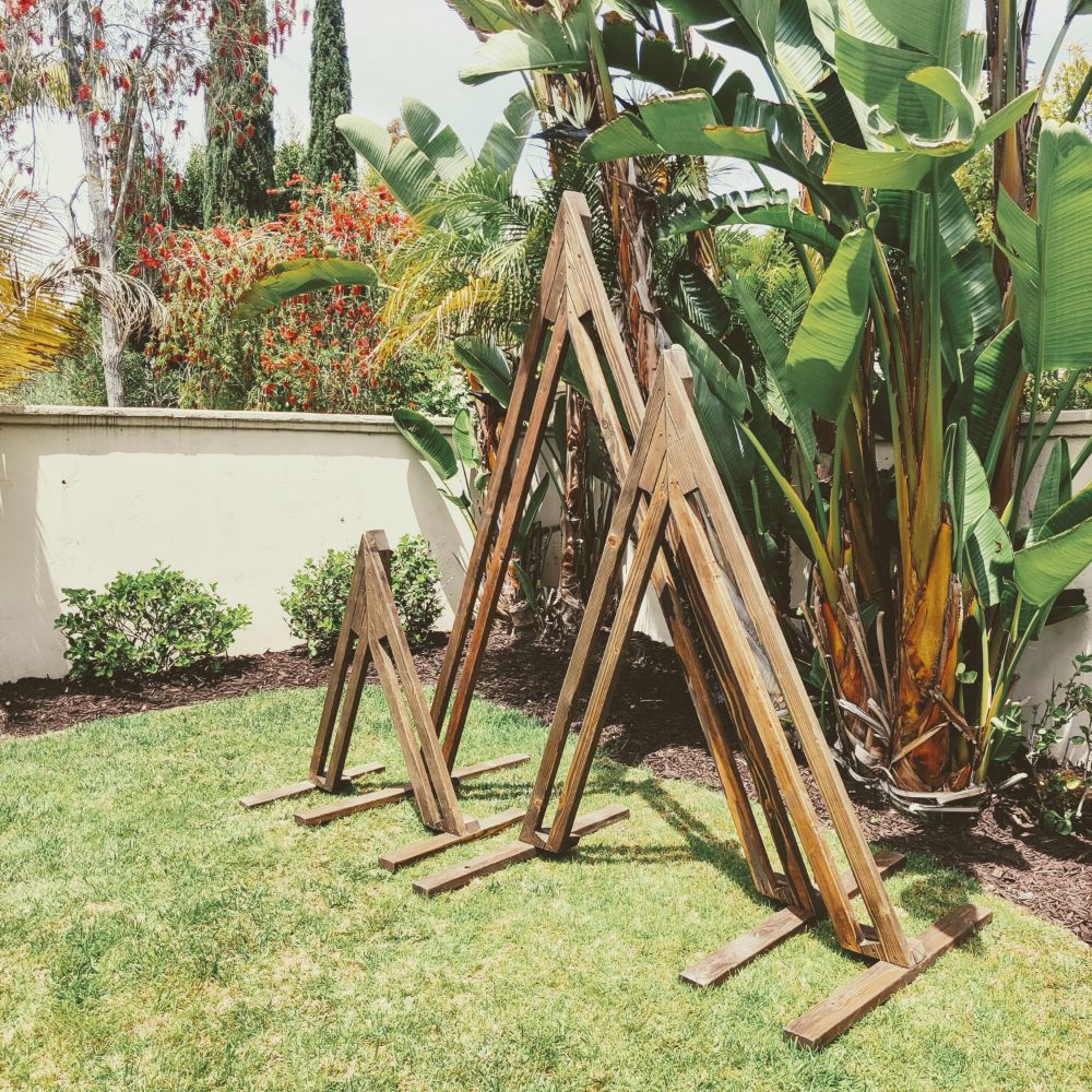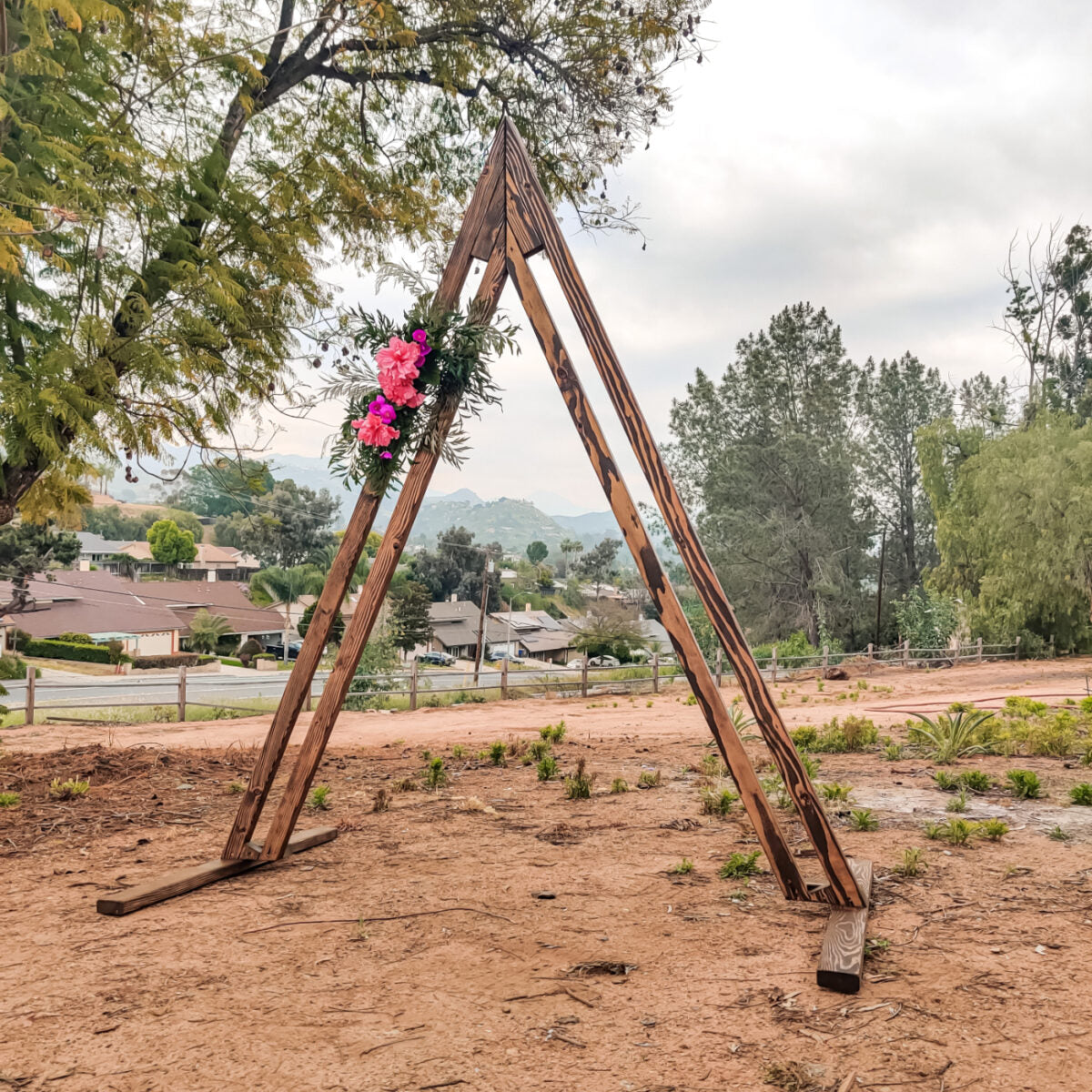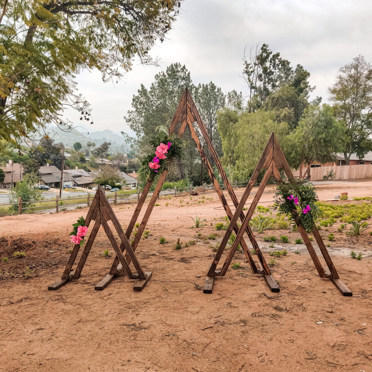 This handmade Triangle Mountain Arch rental item is the perfect accent to any event. Use it as a backdrop for your ceremony, your bar, or behind one of our lounges. Each triangle is individual and can be arranged in three different ways.