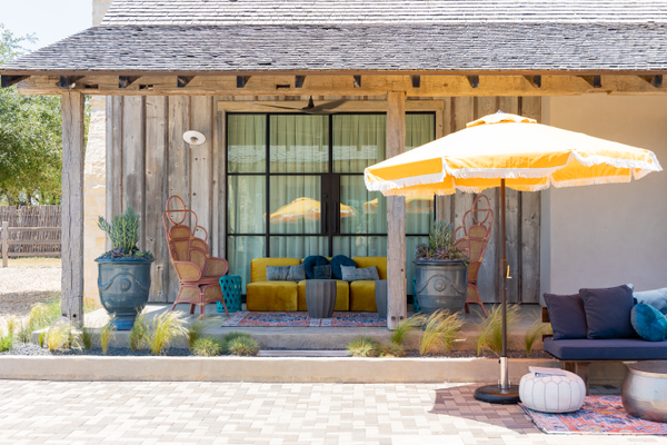 Stain-resistant indoor/outdoor poly-cotton blend area rug.