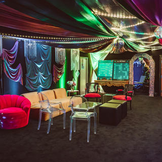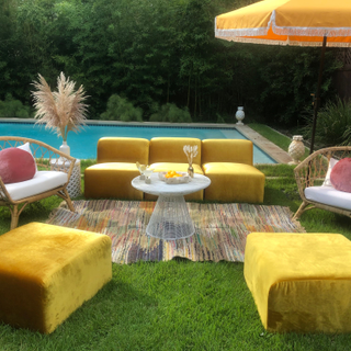 Gold velvet armless sofa that can be arranged in multiple looks.