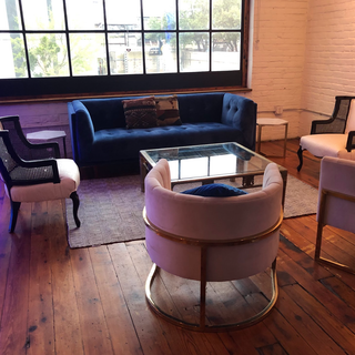 The luxe navy fabric, button tufts, tapered wood legs, and clean-lined design give this sofa a touch of classic midcentury style.