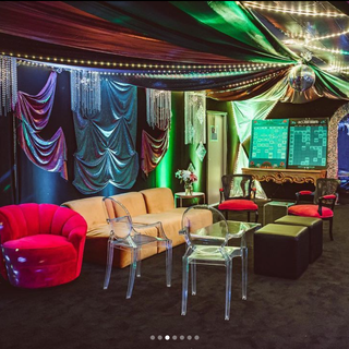 These simply glamorous Louis XV-style armchairs feature a black frame, cane back, and fuchsia velvet upholstery.
