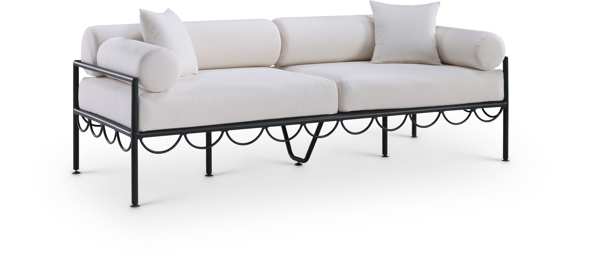 Bold art deco lines and plush cream water-repellent fabric define the Portofino patio armchair. Wrapped in a matte black aluminum frame, it balances striking design with outdoor durability. Perfect for lounging under the sun or stargazing in style, this chair turns any outdoor space into a chic retreat.