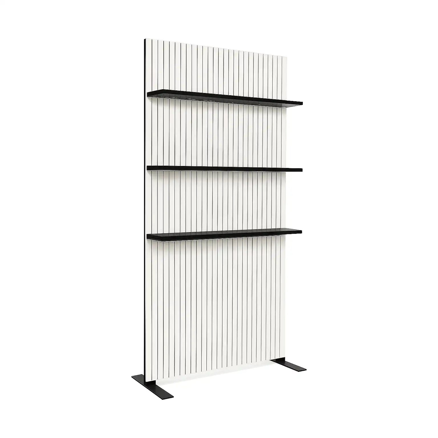 Bright, modern, and endlessly versatile — The Ridge Bar Back W/ Shelves – White brings clean lines and visual balance to any upscale event. Featuring crisp white vertical slats with subtle black in-between accents, three black floating shelves, and a matte black base, it’s the perfect blend of function and sophistication.