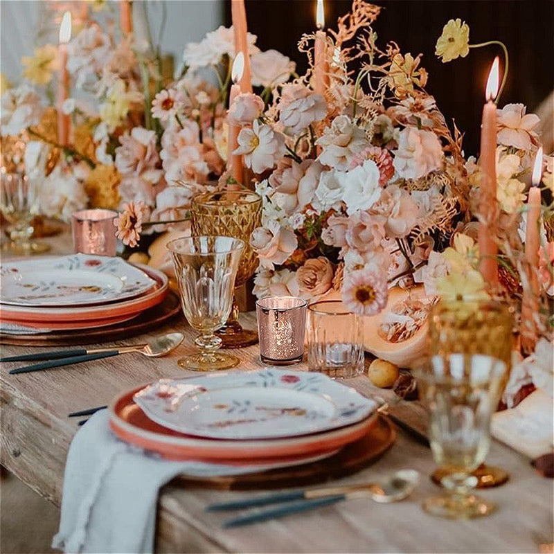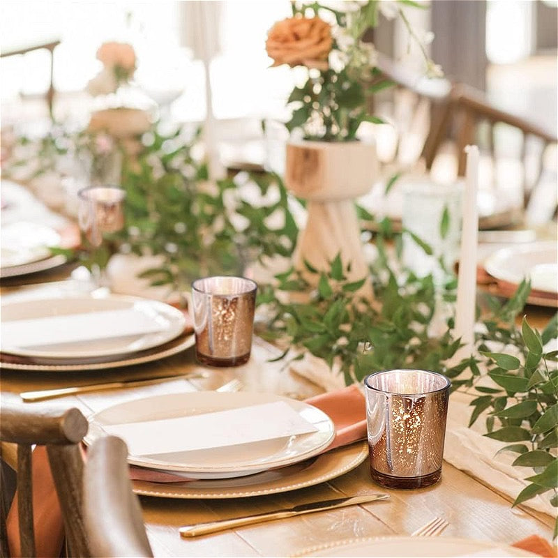 Our Rose Gold Mercury Votive Candle Holders have a metallic finish with a beautiful mercury speckled effect that will enhance the natural warm light of votive candles, giving it a vintage but timeless look. Works with regular votive candles, tealight candles and flameless LED tea light candles.